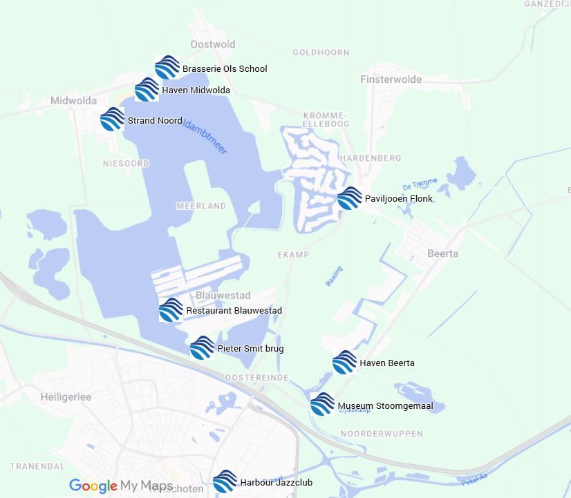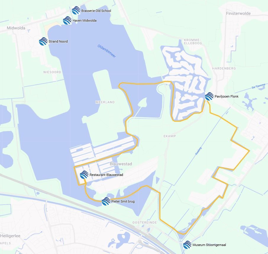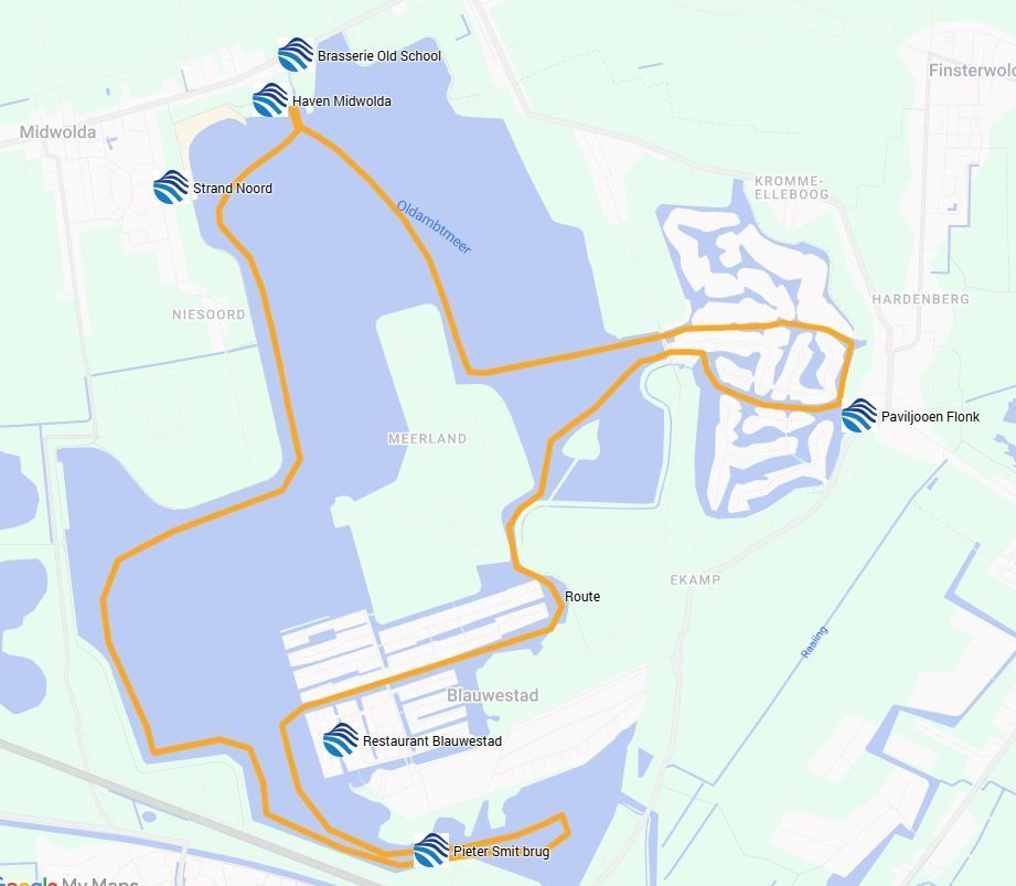 Opstappen in de haven van Midwolda. Via de oevers van het Oldambtmeer zetten we koers naar de Pieter Smitbrug. Vervolgens varen we langs de vele prachtige woningen in Blauwestad en gaan we via Meerland en het Riet weer terug richting Midwolda.